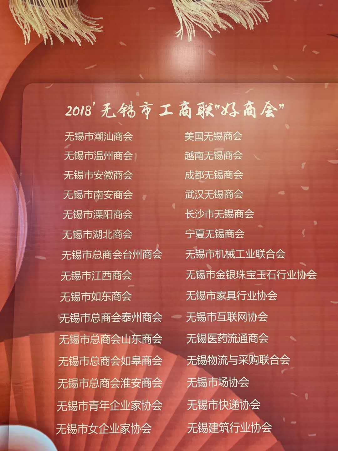 2019年2月18日,市委統(tǒng)戰(zhàn)部、市工商聯(lián)舉辦“弘揚(yáng)工商文化?匯聚民企力量”無(wú)錫市政企服務(wù)直通車(chē)啟動(dòng)儀式暨2019無(wú)錫市工商聯(lián)海內(nèi)外商會(huì)新春嘉年華活動(dòng),表彰了30名“2018無(wú)錫市非公經(jīng)濟(jì)人士‘好榜樣’”、30家“2018無(wú)錫市工商聯(lián)‘好商會(huì)’”、10篇“2018無(wú)錫民營(yíng)企業(yè)‘好新聞’”作品。市領(lǐng)導(dǎo)周敏煒、陳德榮、袁飛、魏多、高亞光、吳仲林出席儀式,孫志亮參加活動(dòng)。無(wú)錫市場(chǎng)協(xié)會(huì)被評(píng)為2018無(wú)錫市工商聯(lián)好商會(huì)。