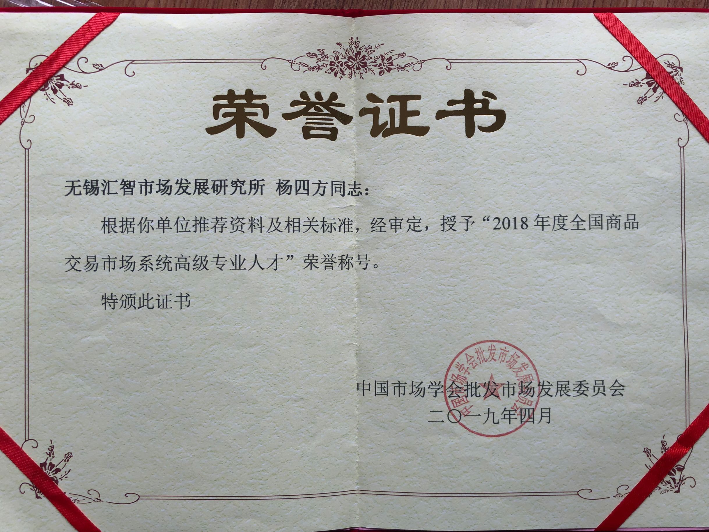 2019年4月24-26日,第20屆中國商品交易市場發(fā)展論壇暨2018年度全國商品交易市場表彰大會,在山東煙臺國際博覽中心隆重召開。無錫匯智市場發(fā)展研究所 楊四方同志榮獲“2018年全國商品交易市場系統(tǒng)高級專業(yè)人才”的稱號。這不僅是個人的榮譽,也是中國市場學會,對匯智市場發(fā)展研究所的肯定。匯智研究發(fā)展所,自成立以來,就為市場調研、行業(yè)發(fā)展作出具有代表性的文章若干,為推進市場發(fā)展提供數據參考依據,得到了各相關部門的肯定和贊揚。 | | |  |