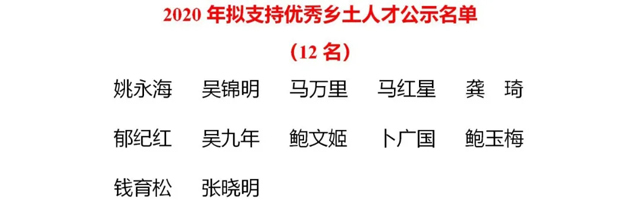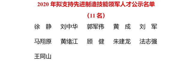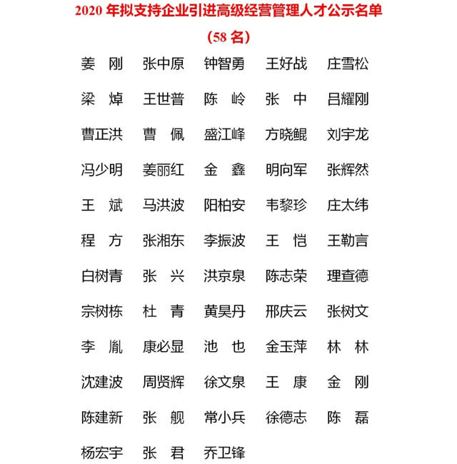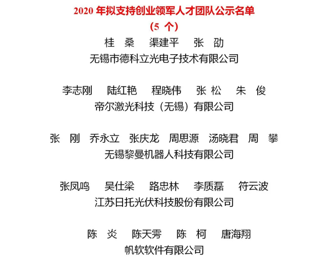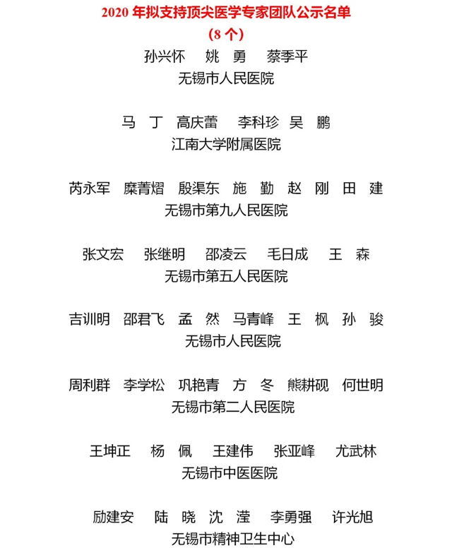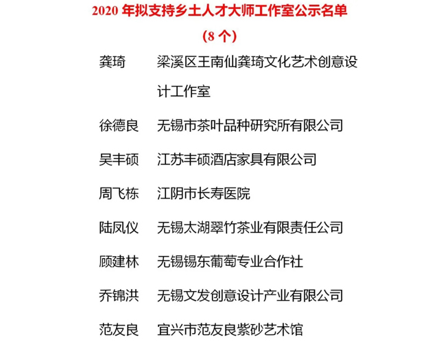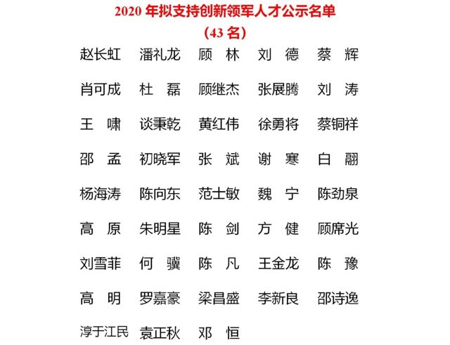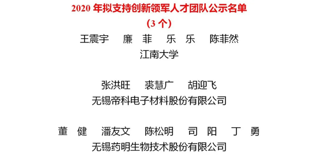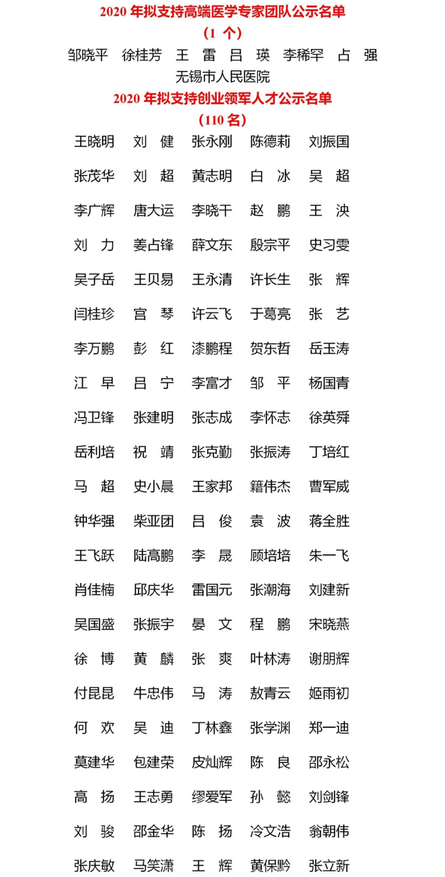 2020年無錫市“太湖人才計劃”由市人才工作領(lǐng)導(dǎo)小組辦公室、市科技局、市工業(yè)和信息化局、市財政局、市人力資源社會保障局、市衛(wèi)生健康委等部門組織實施,經(jīng)項目初審、現(xiàn)場考察、路演評審、市人才辦聯(lián)席會議審議等程序,遴選出擬支持創(chuàng)業(yè)領(lǐng)軍人才團隊5 個、創(chuàng)新領(lǐng)軍人才團隊3 個、頂尖醫(yī)學(xué)專家團隊8個、高端醫(yī)學(xué)專家團隊1個、創(chuàng)業(yè)領(lǐng)軍人才110名、創(chuàng)新領(lǐng)軍人才43名、企業(yè)引進高級經(jīng)營管理人才58名、高端會計人才5名、先進制造技能領(lǐng)軍人才11 名、優(yōu)秀鄉(xiāng)土人才12名、鄉(xiāng)土人才大師工作室8個,現(xiàn)予以公示。