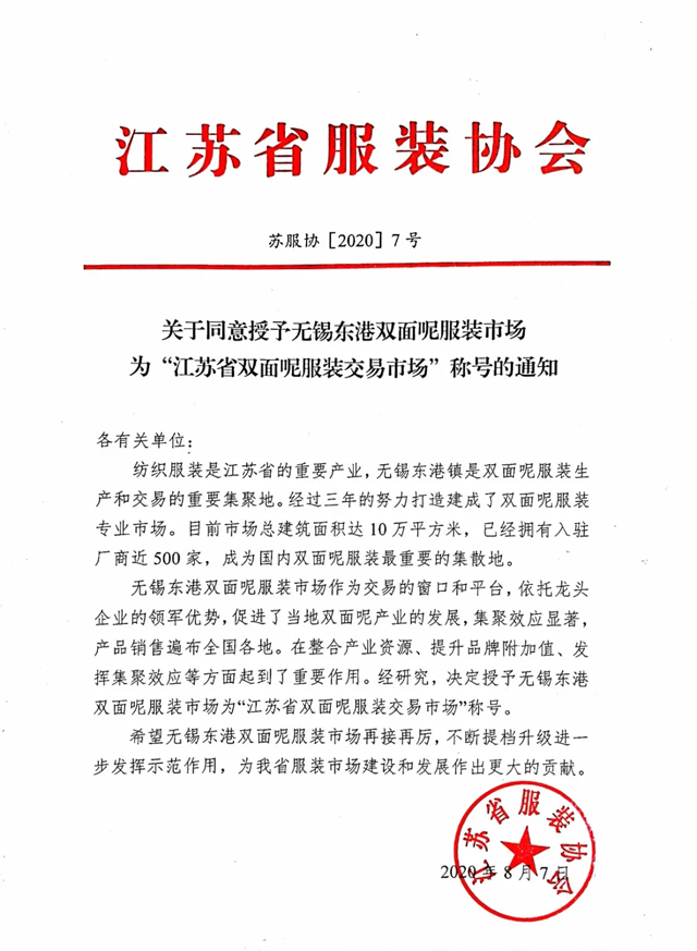 喜訊!無(wú)錫東港雙面呢服裝市場(chǎng)被授予“江蘇省雙面呢服裝交易市場(chǎng)”稱(chēng)號(hào)