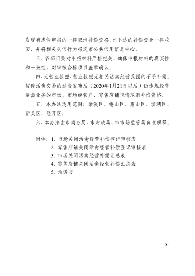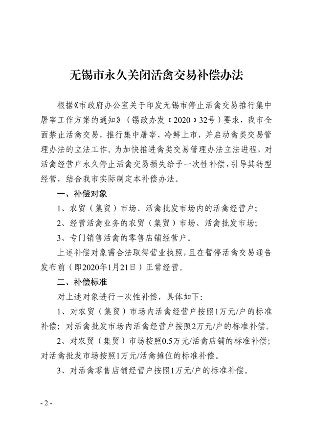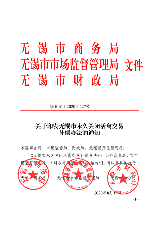 關(guān)于印發(fā)無錫市永久關(guān)閉活禽交易補(bǔ)償辦法的通知(錫商發(fā)[2020]227號(hào))