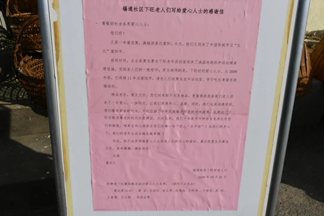 重陽節(jié),又稱“踏秋節(jié)”,自古以來,重陽就是百姓走親訪友的佳節(jié)。參加本次活動的老人平均年齡均已超過了60歲,有些年紀大了拄著拐杖,由家中小輩們小心翼翼攙扶著前來,有些不便出門卻也殷切叮囑著讓小輩代替自己拿著面票過來領(lǐng)面,現(xiàn)場更多的則是一些許久未見的老姐妹兄弟借此機會激動地?zé)崆橄鄵?執(zhí)手相敘?;顒邮彝馇镲L(fēng)微涼,活動室內(nèi)老人們熱熱鬧鬧地聚在一起閑話家常,吃著熱騰騰的面條,心底暖洋洋。“物品有價,情義無價,你們送來的不光是物品,更重要的是給我們老人送來了一片愛心,一抹陽光,讓我們深感開心、溫暖。我們不知道用何種語言來表達對你們的謝意,唯有在內(nèi)心深深為你們祈禱一句‘好人一生平安’!我們知道在你們的關(guān)心下,一定會一年過得比一年好,我們的臉上也會永遠笑顏如花。”老人們通過張貼感謝信的方式表達了對愛心人士的由衷感謝。