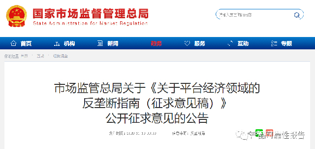 二、通過電子郵件將意見發(fā)送fldj@samr.gov.cn,郵件主題請注明“《關(guān)于平臺經(jīng)濟(jì)領(lǐng)域的反壟斷指南(征求意見稿)》公開征求意見”。