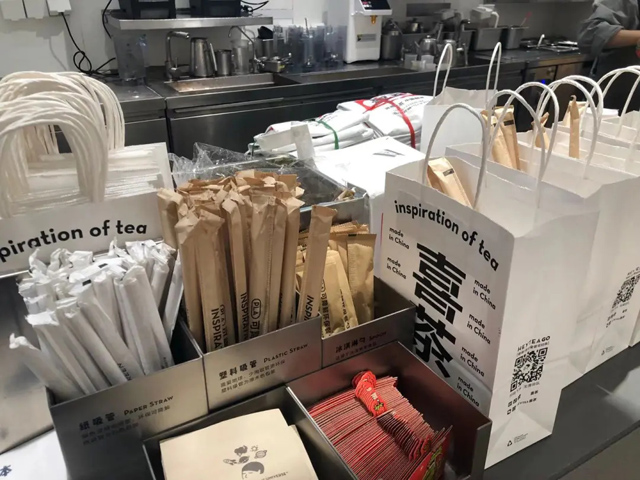 在喜茶的打包區(qū)內(nèi),擺放著紙質(zhì)吸管、塑料吸管、冰淇淋勺等餐具,供顧客自行選用。記者在店內(nèi)近20分鐘,前來取餐的顧客一律選了塑料吸管。而店員在進行外賣打包時裝入的也都是塑料吸管?!斑@是可降解環(huán)保吸管。”店員指著塑料吸管解釋,從去年6月份開始,喜茶各門店就統(tǒng)一換上了這款PLA吸管,同時還針對芝士類茶飲推出了不需要吸管的旋轉(zhuǎn)蓋。“但既不影響口感,又環(huán)保,目前我們主要用的都是這種吸管。”該店員介紹,雖然吸管成本有所上升,但留住了顧客。