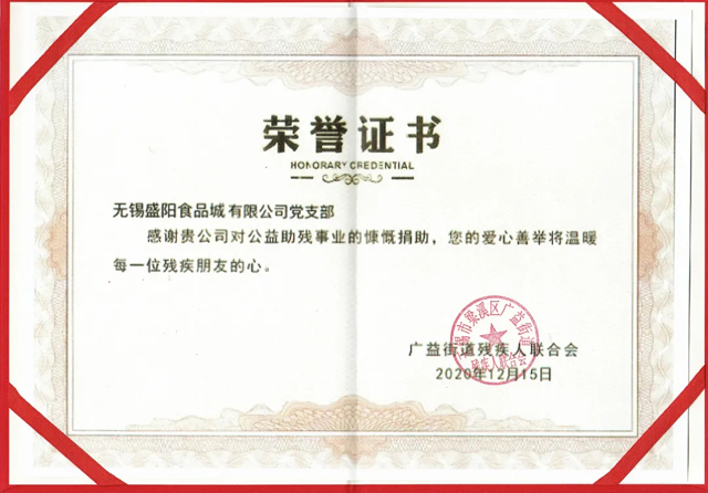 恭賀無錫盛陽食品城黨支部榮獲廣益街道殘疾人聯(lián)合會頒發(fā)的“益心共助”榮譽證書!盛陽黨支部書記華曙東同志代表公司黨支部參加了2020年12月15日在梁溪區(qū)廣益街道益家殘疾人之家,由廣益街道殘疾人聯(lián)合會主辦的“讓愛牽手 益路同行”黨建助殘活動。