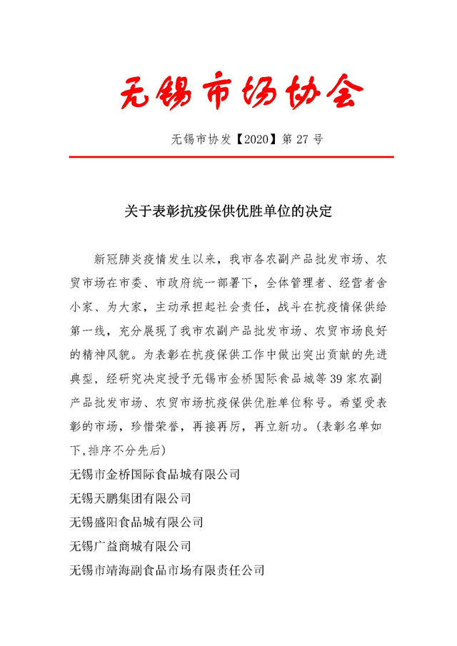 無錫市協(xié)發(fā)【2020】第27號關(guān)于表彰抗疫保供優(yōu)勝單位的決定