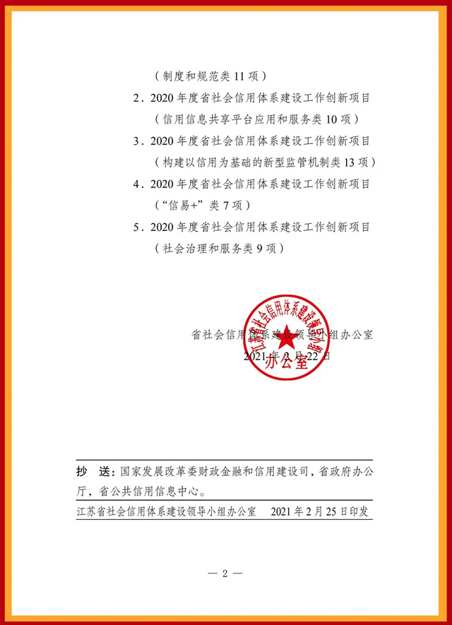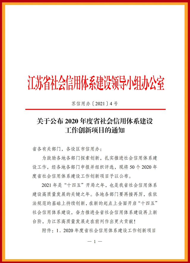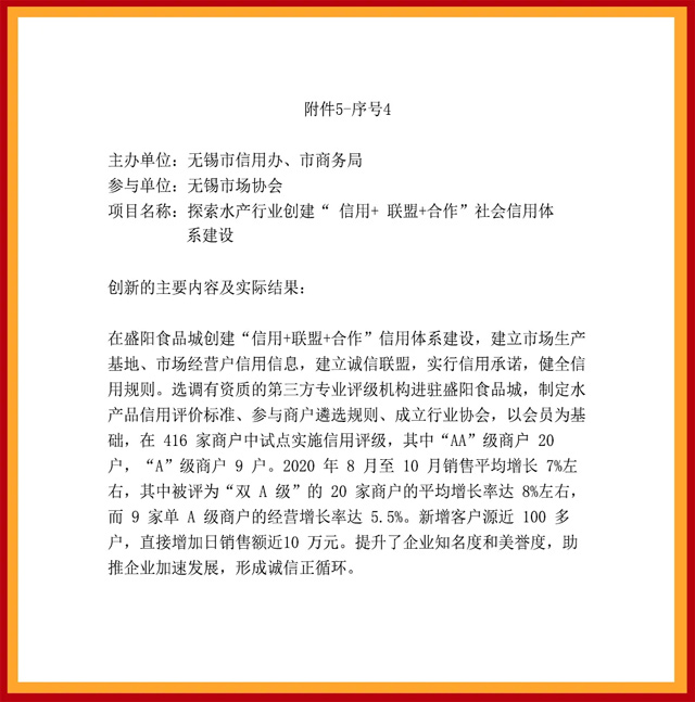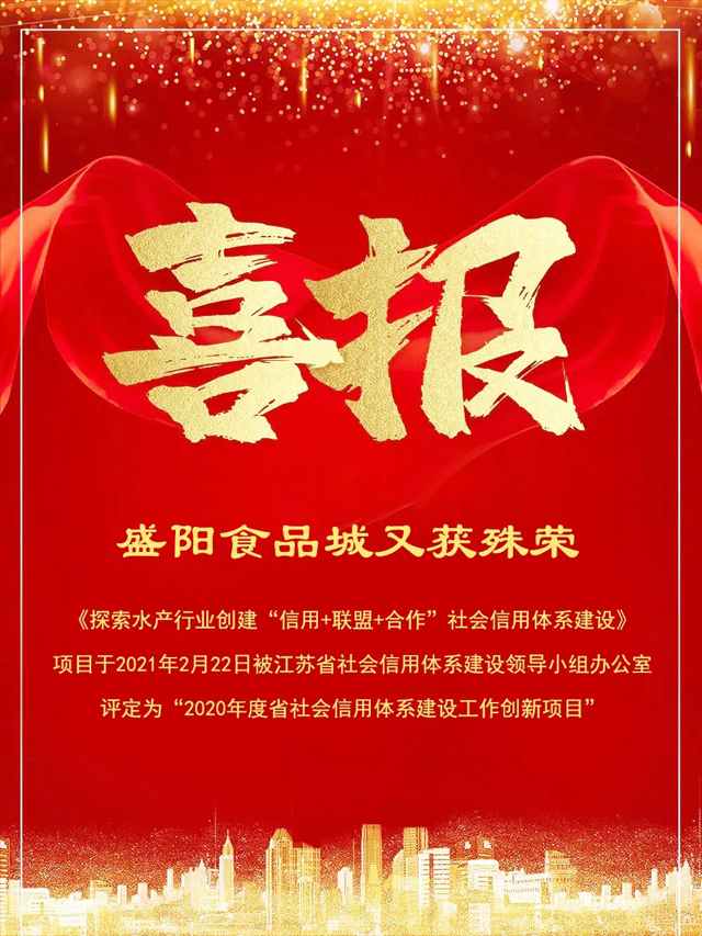 提升了企業(yè)知名度和美譽(yù)度,助推企業(yè)加速發(fā)展,形成誠(chéng)信正循環(huán)。此《探索水產(chǎn)行業(yè)創(chuàng)建“信用+聯(lián)盟+合作”社會(huì)信用體系建設(shè)》項(xiàng)目于2021年2月22日被江蘇省社會(huì)信用體系建設(shè)領(lǐng)導(dǎo)小組辦公室評(píng)定為“2020年度省社會(huì)信用體系建設(shè)工作創(chuàng)新項(xiàng)目”。