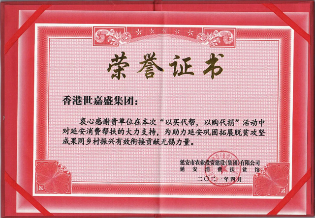 最后,延安市政府副市長單舒平同志對座談會進行了總結,表示延安與無錫長期以來是對口幫扶友好城市,希望通過此次考察活動,進一步加深無錫與延安的發(fā)展協(xié)作,實現互利共贏。因在本次“以買代幫、以購代捐”活動中對延安消費幫扶工作的大力支持,香港世嘉盛集團被延安市政府機關授予《消費幫扶愛心企業(yè)》的榮譽。