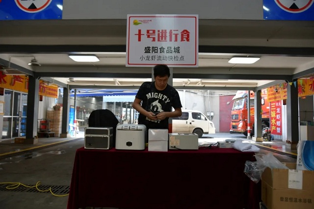 此次食品安全檢查,以當(dāng)前熱銷的水產(chǎn)品小龍蝦為主要檢查對象,設(shè)置主題為“十號進行食”的小龍蝦流動快檢點,以便通過第三方檢測機構(gòu)現(xiàn)場隨機取樣檢測小龍蝦的安全性,同時市場監(jiān)管局同志通過現(xiàn)場了解及臺賬查驗等檢查方式,以提升經(jīng)營商戶建立“索證索票”意識,規(guī)范食品安全建設(shè),保障市民舌尖上的安全。
