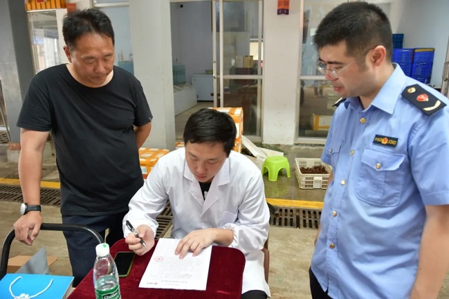 在華總和馮總的陪同下,在盛陽職工和經(jīng)營商戶的積極配合下,檢測人員抽取了3家小龍蝦樣本。在抽檢過程中,華超同志對經(jīng)營商戶的貨源地、銷售臺賬進行了現(xiàn)場抽查,在肯定盛陽食品城規(guī)范化管理市場的同時,對商戶臺賬登記有些不規(guī)范之處給出了改進建議。