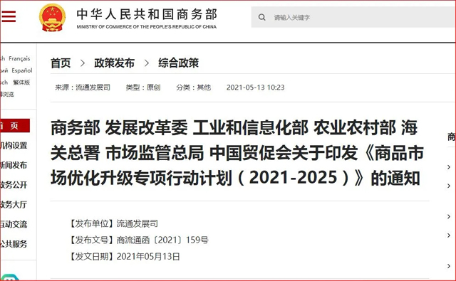 商務(wù)部 發(fā)展改革委 工業(yè)和信息化部 農(nóng)業(yè)農(nóng)村部 海關(guān)總署 市場監(jiān)管總局 中國貿(mào)促會關(guān)于印發(fā)《商品市場優(yōu)化升級專項行動計劃(2021-2025)》的通知
