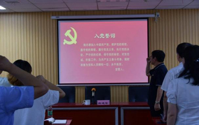 上午9:30,大會(huì)正式召開?;顒?dòng)共分為兩項(xiàng)議程。第一項(xiàng):重溫入黨誓詞。在盛陽食品城黨支部書記華曙東同志的領(lǐng)讀下,全體參會(huì)黨員面向黨旗,重溫了光榮的入黨時(shí)刻,莊重宣誓。