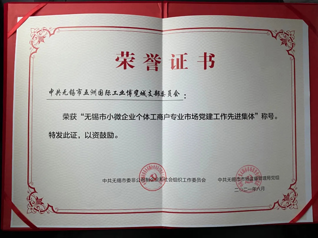 無錫五洲國際工業(yè)博覽城黨支部成立于2011年,立足市場,根據(jù)自身非公制黨支的特性,推動基層黨組織規(guī)范,標準化建設,曾被評為“ 全國商品交易市場黨建示范單位 ”。在抗擊新冠疫情期間,更是充分發(fā)揮了基層黨組織戰(zhàn)斗堡壘作用和黨員先鋒模范作用,榮獲了戰(zhàn)“疫”一線先進基層黨組織等殊榮。
