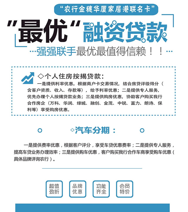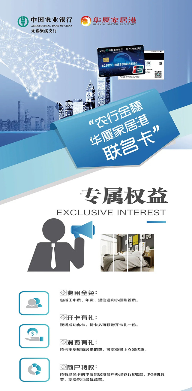 華總現(xiàn)場(chǎng)透露“農(nóng)行金穗—華廈家居港聯(lián)名卡”是農(nóng)行與華廈家居港聯(lián)合推出的聯(lián)名借記卡,這在無(wú)錫建材家居賣場(chǎng)中屬于首次!這張卡既有存取現(xiàn)金、刷卡消費(fèi)、轉(zhuǎn)賬等銀行卡功能,也有一些額外的服務(wù):比如持卡顧客到華廈家居港消費(fèi)有折上立減優(yōu)惠;持卡商戶辦理農(nóng)行POS機(jī)可享最優(yōu)政策等。相信這張卡,會(huì)給消費(fèi)者、給商戶都帶來(lái)實(shí)實(shí)在在的優(yōu)惠與便捷。
