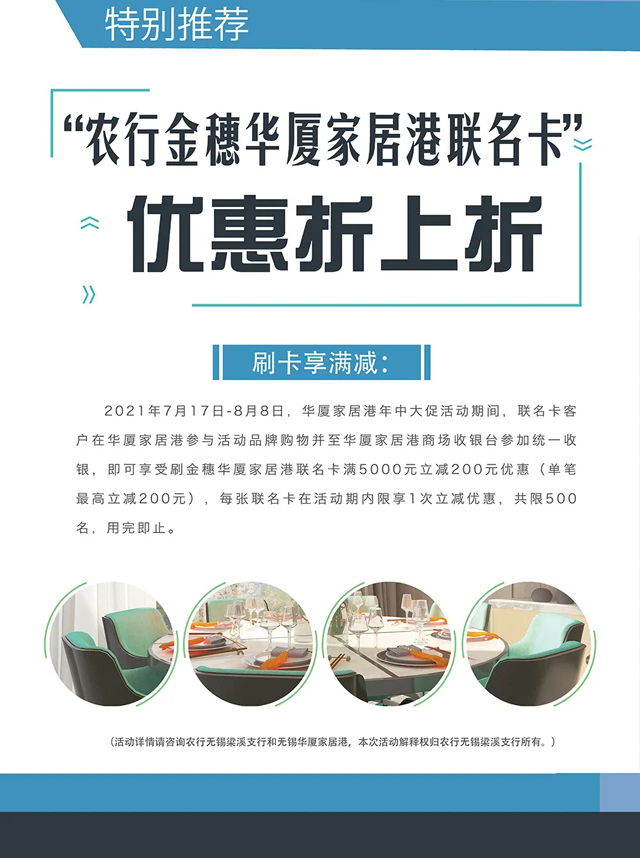 2021年7月15日,“農(nóng)行金穗—華廈家居港聯(lián)名卡”開(kāi)卡儀式在華廈家居港家具館中廳舉辦。