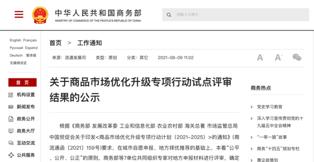 8月9日,商務(wù)部網(wǎng)站消息,根據(jù)《商務(wù)部 發(fā)展改革委 工業(yè)和信息化部 農(nóng)業(yè)農(nóng)村部 海關(guān)總署 市場(chǎng)監(jiān)管總局 中國貿(mào)促會(huì)關(guān)于印發(fā)<商品市場(chǎng)優(yōu)化升級(jí)專項(xiàng)行動(dòng)計(jì)劃(2021-2025)>的通知》要求,在城市自愿申報(bào)、地方擇優(yōu)推薦的基礎(chǔ)上,本著“公平、公開、公正”的原則,商務(wù)部等7單位共同組織專家對(duì)地方申報(bào)材料進(jìn)行評(píng)審,確定了商品市場(chǎng)優(yōu)化升級(jí)專項(xiàng)行動(dòng)試點(diǎn),并將名單進(jìn)行公示。