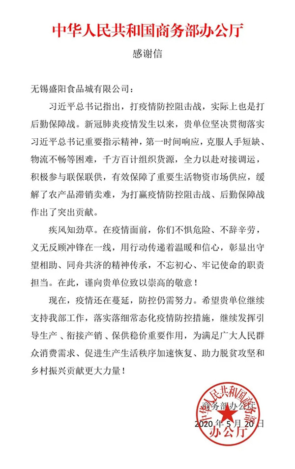 湖北素有“小龍蝦之鄉(xiāng)”之稱,去年由于疫情,大量的小龍蝦滯留在湖北養(yǎng)殖地。依托于本公司的綜合銷售渠道,龔志勇積極對接湖北武漢、荊州的滯銷養(yǎng)殖地,提供銷售渠道援助,通過便捷的物流貨運(yùn),做到人員不接觸水產(chǎn)送到家,一方面滿足市場銷售,一方面通過盛陽綜合銷售渠道向全國各地小龍蝦銷售市場發(fā)布信息,協(xié)調(diào)貨源,聯(lián)系物流,落地產(chǎn)銷雙方商業(yè)合作。2020年度累計(jì)銷售湖北河蝦2萬斤、小龍蝦260萬斤,通過渠道銷往全國各地達(dá)300萬斤左右,努力解決滯銷問題,在攜手社會各界共抗疫情中發(fā)揮了積極的民營企業(yè)力量。2020年5月20日,盛陽食品城收到國家商務(wù)部辦公廳的感謝信:“在疫情面前,你們不懼危險(xiǎn)、不辭辛勞,義無反顧沖鋒在一線,用行動傳遞著溫暖和信心,彰顯出守望相助、同舟共濟(jì)的精神傳承,不忘初心、牢記使命的職責(zé)擔(dān)當(dāng)。”