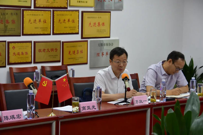 根據(jù)江蘇省市場監(jiān)督管理局蘇市監(jiān)辦【2021】132號發(fā)《省市場監(jiān)管局關(guān)于省局領(lǐng)導(dǎo)班子成員掛鉤聯(lián)系“小個?!秉h組織的通知》的文件要求,為了加強(qiáng)對“小個?!秉h建工作的指導(dǎo),2021年9月16日10:00,在無錫盛陽食品城有限公司召開了江蘇省市場監(jiān)督管理局“小個專”黨建工作掛鉤聯(lián)系點座談會。江蘇省市場監(jiān)督管理局黨組成員、副局長陳琪宏同志一行4人,無錫市梁溪區(qū)政府黨組成員、副區(qū)長周曉紅同志,無錫市梁溪區(qū)委“兩新”工委副書記盧成宗同志,梁溪區(qū)廣益街道黨工委副書記馮云峰同志,黨工委副書記、無錫市食品科技園主任俞夸同志,以及無錫市市、區(qū)、街道市場監(jiān)督管理局多名同志,無錫盛陽食品城有限公司董事長、總經(jīng)理龔志勇同志,黨支部書記、常務(wù)副總?cè)A曙東同志,梁溪區(qū)水產(chǎn)行業(yè)工會聯(lián)合會主席丁偉峰同志,盛陽食品城經(jīng)營戶代表殷若慶同志、錢志東同志、施佰泉同志參加了本次座談會。