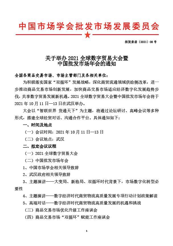 關于舉辦2021全球數(shù)字貿(mào)易大會暨中國批發(fā)市場年會的通知