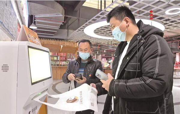 昨天,市民在周新農(nóng)貿(mào)市場掃碼領(lǐng)取可降解環(huán)保袋。該市場在經(jīng)營區(qū)增設(shè)了免費(fèi)領(lǐng)取機(jī),為市民提供了方便。(劉芳輝 攝)