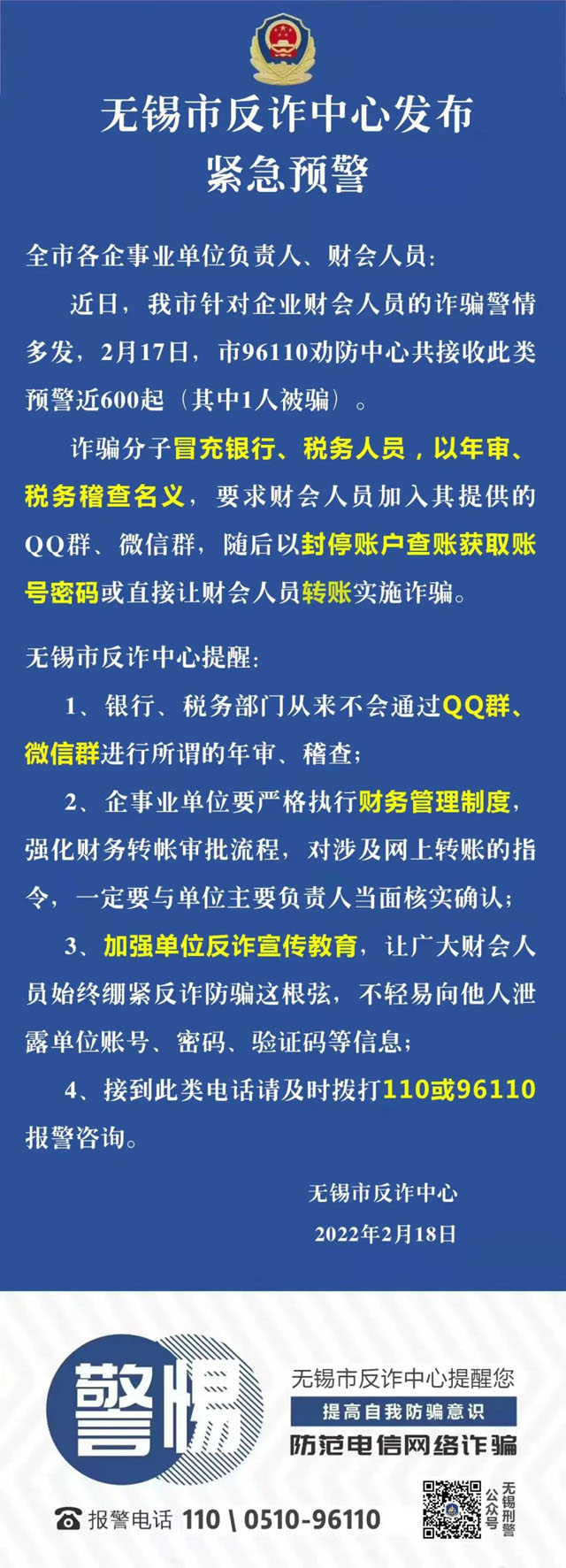 2月17日,市96110勸防中心共接收此類預(yù)警近600起(其中1人被騙)。詐騙分子冒充銀行、稅務(wù)人員,以年審、稅務(wù)稽查名義,要求財會人員加入其提供的QQ群、微信群,隨后以封停賬戶查賬獲取賬號密碼或直接讓財會人員轉(zhuǎn)賬實施詐騙。