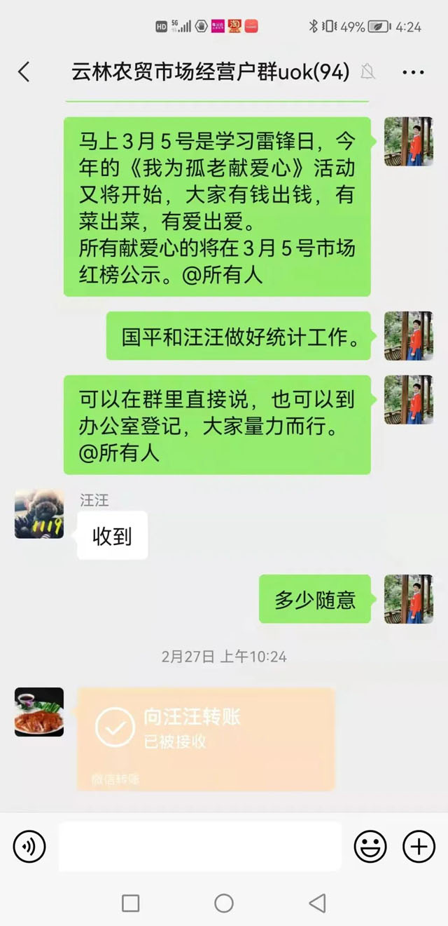 在第60個學(xué)雷鋒紀(jì)念日來臨之際,云林商會理事、云林青商會副會長、無錫麒銘物業(yè)管理有限公司總經(jīng)理、麒銘愛心小分隊大掌柜張燕紅又在微信群里號召云林農(nóng)貿(mào)市場的愛心商戶們奉獻愛心,為一年一度的“我為孤老獻愛心”活動出錢出力。