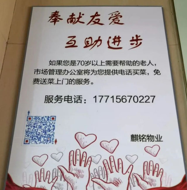 2016年,張燕紅成立了無錫麒銘物業(yè)管理有限公司,秉承著”人性化服務(wù),規(guī)范化管理,市場化運作,多元化經(jīng)營”的指導(dǎo)思想,大力倡導(dǎo)“誠實守信,自覺奉獻”的敬業(yè)精神。為了更好地服務(wù)周邊的居民和樹立好口碑,2017年6月,麒銘物業(yè)在云林農(nóng)貿(mào)市場開展了一項為70歲以上需要幫助的老人免費提供電話買菜、送菜上門的服務(wù)。服務(wù)一推出,市場反應(yīng)卻是很冷清,為了不讓這項服務(wù)流于形式,張燕紅轉(zhuǎn)變思路,帶著團隊骨干去市場周邊社區(qū)摸排,到居委詢問,經(jīng)過多方核實,最終確認(rèn)了16戶特困、孤老、殘障家庭,將上門送菜服務(wù)變成一項扶弱助殘公益服務(wù)。當(dāng)年10月,公司便成立了“麒銘愛心小分隊”,每周定期給登記在冊的老人上門贈送免費愛心菜。