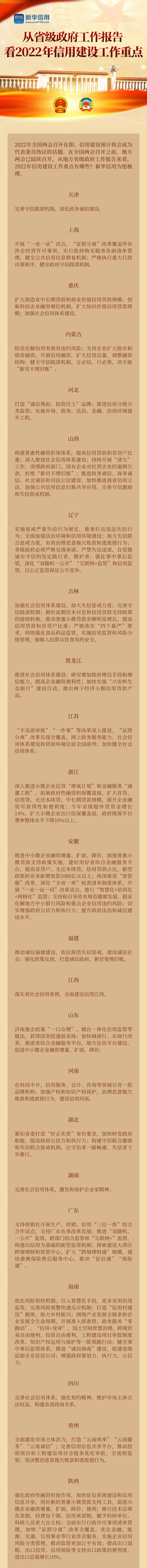 新華信用北京3月3日電(胡俊超、馮鈺林)2022年全國兩會召開在即,信用建設(shè)預(yù)計將會成為代表委員熱議的話題。在全國兩會召開之前,地方兩會已陸續(xù)召開,從地方省級政府工作報告來看,2022年信用建設(shè)有哪些關(guān)鍵詞?新華信用為您梳理。