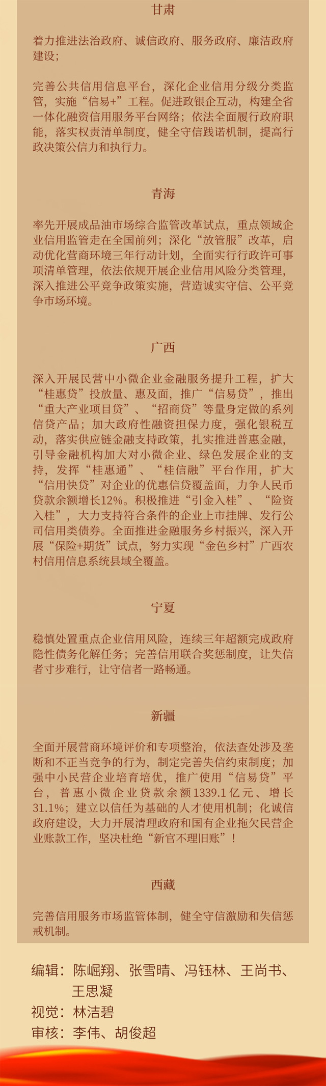 不少地方在2022年的政府工作報告中,將擴大信用貸款規(guī)模、推廣“信易貸”提到了突出位置。如:重慶市政府工作報告提出,擴大制造業(yè)中長期貸款和商業(yè)價值信用貸款規(guī)模;山西省政府工作報告提出,構(gòu)建普惠性融資擔保體系,提高信用貸款和首貸戶比重,促進中小微企業(yè)融資增量、擴面、降價;吉林省政府工作報告提出,做好延期還本付息和信用貸款支持政策的接續(xù)轉(zhuǎn)換,推動普惠小微貸款余額明顯增長,提高信用貸款和首貸戶比重;浙江省政府工作報告提出,深入推進小微企業(yè)信貸“增氧計劃”和金融服務(wù)“滴灌工程”,拓展政府性融資擔保覆蓋面,擴大首貸、信用貸、無還本續(xù)貸、中長期貸款規(guī)模,提升企業(yè)融資可獲得性和便利度;陜西省政府工作報告提出,強化政府性融資擔保作用,加快征信系統(tǒng)建設(shè)和信用信息共享,用好新的普惠小微貸款支持工具,促進小微企業(yè)融資增量、擴面、降價、便利;廣西壯族自治區(qū)政府工作報告提出,引導開發(fā)性、政策性金融機構(gòu)加大中長期信貸支持。深入開展民營中小微企業(yè)金融服務(wù)提升工程,擴大“桂惠貸”投放量、惠及面,推廣“信易貸”,推出“重大產(chǎn)業(yè)項目貸”、“招商貸”等量身定做的系列信貸產(chǎn)品。