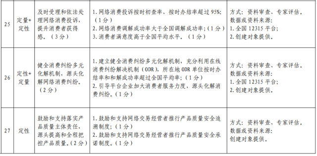 近日,市場監(jiān)管總局發(fā)布《網(wǎng)絡(luò)市場監(jiān)管與服務(wù)示范區(qū)創(chuàng)建管理辦法(試行)》及其配套評估指標(biāo)體系。評估指標(biāo)體系共設(shè)有5個一級指標(biāo)、10個二級指標(biāo)、41個三級指標(biāo),主要用于評估創(chuàng)建對象在促進(jìn)發(fā)展、規(guī)范監(jiān)管、優(yōu)化服務(wù)、探索創(chuàng)新、綜合保障等方面的工作成效。評估指標(biāo)體系合格標(biāo)準(zhǔn)為:總分≧85分,且每個一級指標(biāo)得分率≧75%。