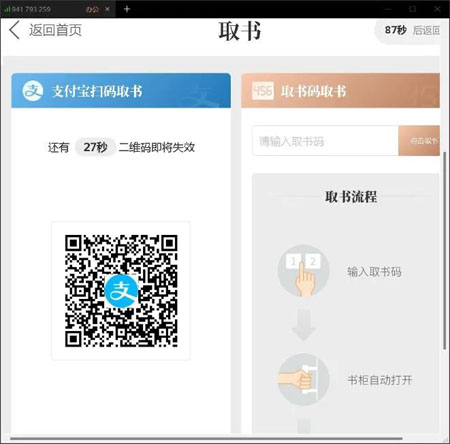 取書方式一: 打開支付寶,掃描二維碼,之后柜門將自動(dòng)打開,讀者取書;