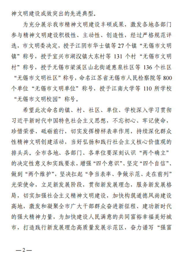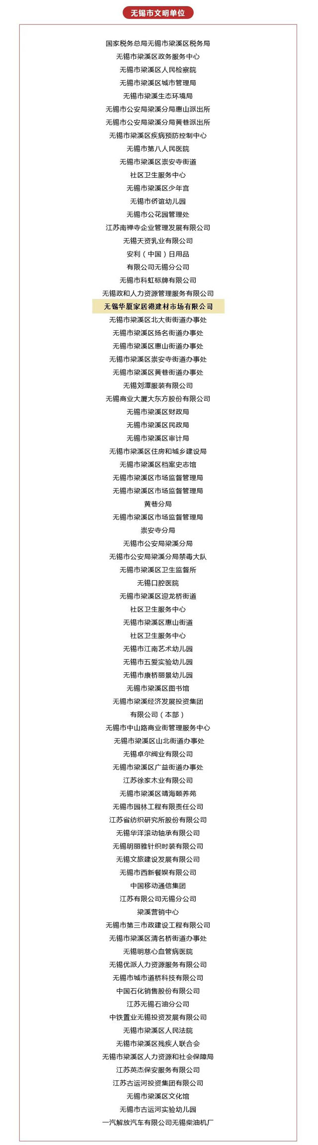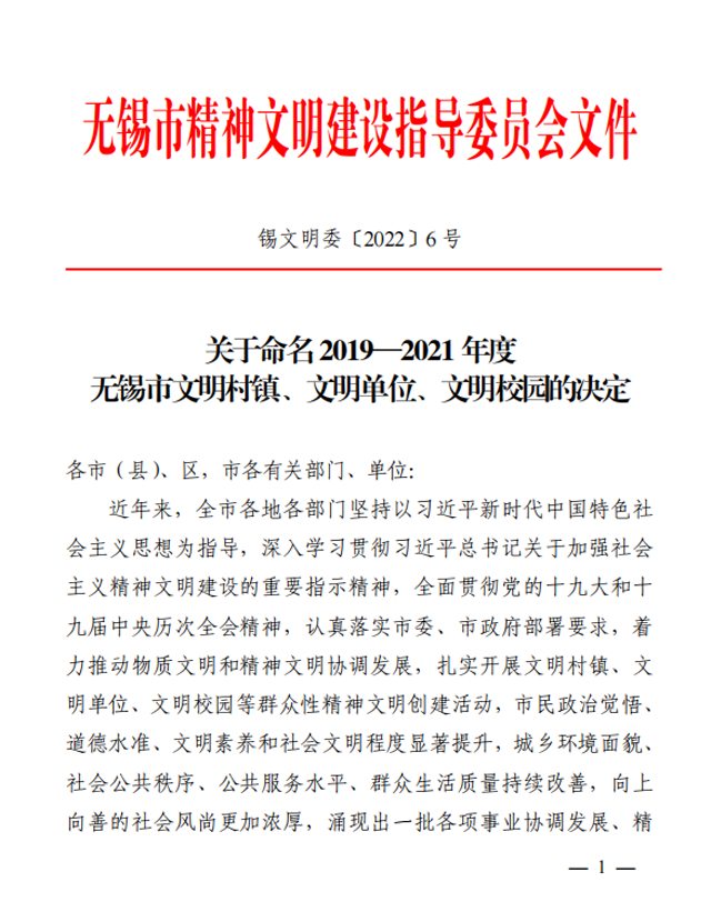 近日,根據(jù)無(wú)錫市精神文明建設(shè)指導(dǎo)委員會(huì)下發(fā)《關(guān)于命名2019—2021年度無(wú)錫市文明村鎮(zhèn)、文明單位、文明校園的決定》(錫文明委〔2022〕6號(hào)),無(wú)錫華廈家居港建材市場(chǎng)有限公司被授予 2019-2021年度“無(wú)錫市文明單位”稱號(hào)。