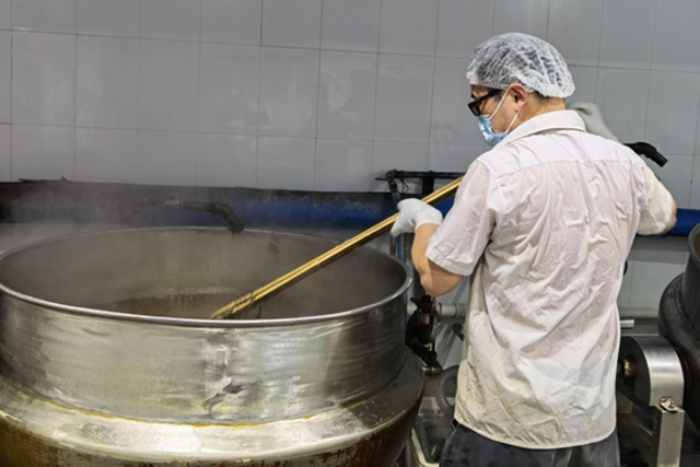 由于生產(chǎn)特殊性,車間內(nèi)無法配備空調(diào),天鵬集團配置了落地大電扇,增加排風(fēng)扇,優(yōu)化通風(fēng)條件,減少員工中暑的幾率。面對持續(xù)高溫天氣,燒煮工人毫無怨言,他們和車間“熔”為一體、齊心協(xié)力,把握好每道工序的關(guān)鍵細(xì)節(jié),只為將“老字號”的經(jīng)典菜肴更完美地呈到市民的餐桌上。