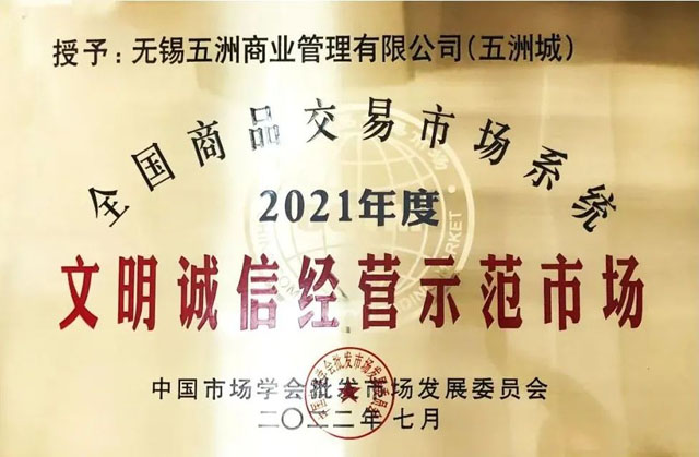 無(wú)錫五洲城榮獲全國(guó)文明誠(chéng)信經(jīng)營(yíng)示范市場(chǎng)榮譽(yù)稱號(hào);
