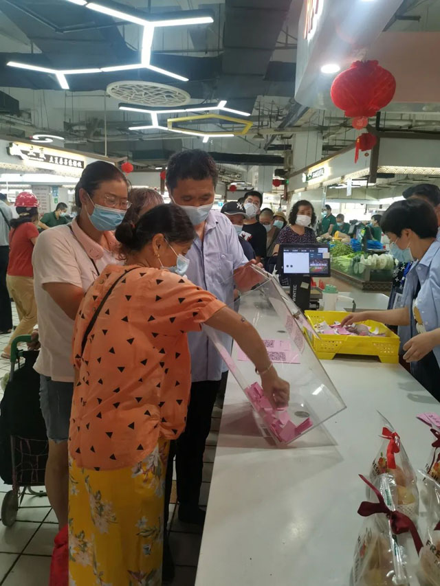 而近期,朝陽農貿市場又推出了溯源小票抽獎活動,為提升消費者的溯源意識,保障食品安全。消費者只要憑當天的溯源小票,就可以參與現(xiàn)場抽獎,中獎者現(xiàn)場領取獎品?;顒右唤浲瞥?,就吸引了眾多消費者的參與。上午9點不到,已經有不少顧客在服務臺前有序排隊,憑小票參與抽獎。抽到獎的顧客喜笑顏開,沒有抽到獎的也開懷一笑,現(xiàn)場氣氛相當熱鬧火爆。原來買菜也是一件這么快樂的事情,既得到了實惠,更能收獲驚喜。