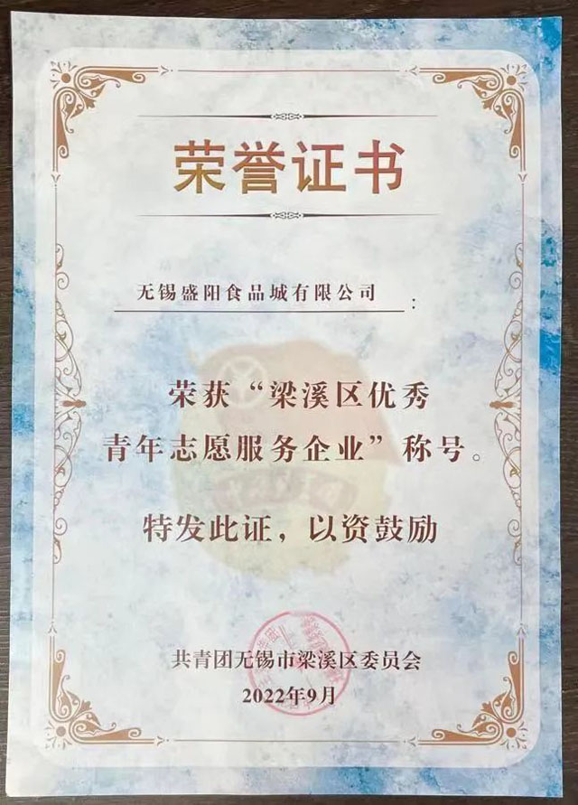 “春種一粒粟,秋收萬(wàn)顆子”,在秋天這個(gè)豐收的季節(jié),各項(xiàng)其他榮譽(yù)也踏著金色光環(huán)接踵而至——中國(guó)共產(chǎn)主義青年團(tuán)無(wú)錫盛陽(yáng)食品城支部委員會(huì)榮獲共青團(tuán)無(wú)錫市委員會(huì)授予的“第22屆青年文明號(hào)”榮譽(yù)稱(chēng)號(hào);無(wú)錫盛陽(yáng)食品城有限公司榮獲由共青團(tuán)無(wú)錫市梁溪區(qū)委員會(huì)授予的“梁溪區(qū)優(yōu)秀青年志愿服務(wù)企業(yè)”榮譽(yù)稱(chēng)號(hào);無(wú)錫市盛陽(yáng)易鮮達(dá)科技有限公司總工程師、技術(shù)部經(jīng)理李飛龍同志,榮獲了由中共無(wú)錫市委宣傳部授予的無(wú)錫“最美職工”榮譽(yù)稱(chēng)號(hào)。
