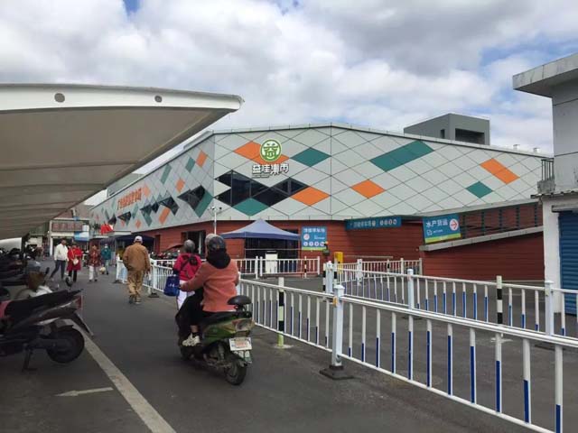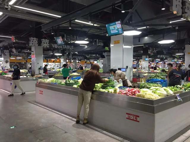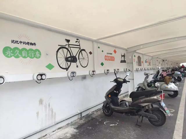 集市大門靠墻的一排車棚內(nèi),每個(gè)車位前都安裝有充電插頭,十分貼心;抬頭一看,墻繪“永久自行車”“蝴蝶牌縫紉機(jī)”“三五牌座鐘”,充滿了溫暖的生活記憶。來到集市入口,掃描個(gè)人門鈴碼進(jìn)入市場,只見墻上的電子屏滾動(dòng)顯示著菜價(jià)、人流量及檢疫信息。