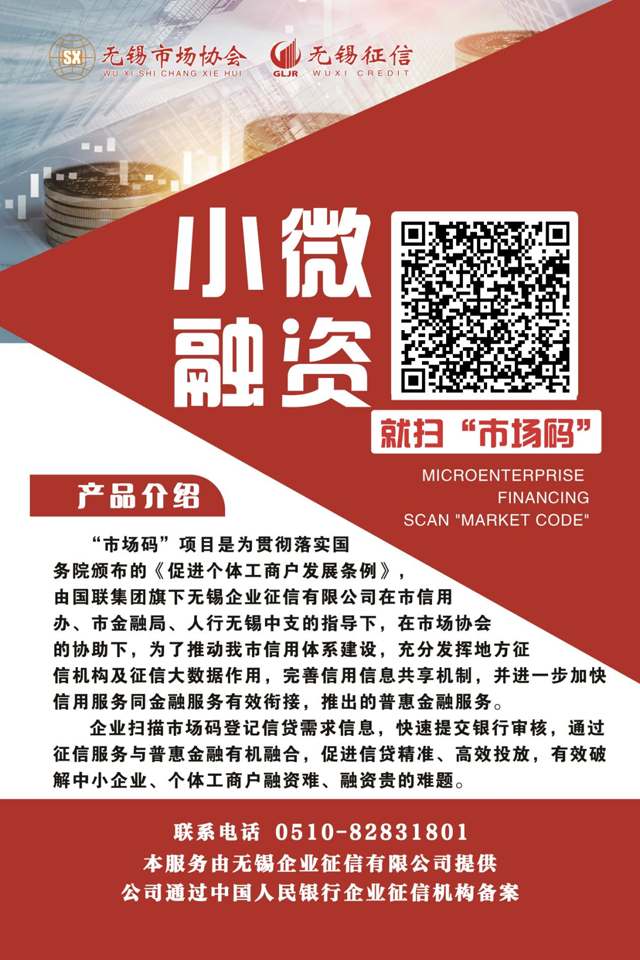 “市場碼”項目是為貫徹落實國務院頒布的《促進個體工商戶發(fā)展條例》,由國聯(lián)集團旗下無錫企業(yè)征信有限公司在市信用辦、市金融局、人行無錫中支的指導下,在市場協(xié)會的協(xié)助下,為了推動我市信用體系建設,充分發(fā)揮地方征信機構及征信大數(shù)據(jù)作用,完善信用信息共享機制,并進一步加快信用服務同金融服務有效銜接,推出的普惠金融服務。