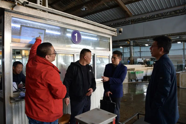 會議開始前,首先由盛陽食品城董事長兼總經(jīng)理龔志勇帶領(lǐng)眾人參觀了企業(yè)文化宣傳長廊,水產(chǎn)行業(yè)工會聯(lián)合會宣傳墻,盛陽黨建、工建、團(tuán)建、產(chǎn)改工作等活動陣地。隨后,龔董陪同客人參觀了公司消控中心、人才公寓,參觀至市場農(nóng)副水產(chǎn)品快速檢測中心和電子溯源系統(tǒng)實(shí)時監(jiān)控中心時,龔董向眾人介紹了盛陽在無錫地區(qū)水產(chǎn)行業(yè)內(nèi)率先建立的“電子溯源結(jié)算系統(tǒng)”和“水產(chǎn)品快速檢測中心”兩大水產(chǎn)食安保障體系。至魚類交易區(qū)時,由盛陽運(yùn)營板塊負(fù)責(zé)人馮敏及相關(guān)工作人員為眾人現(xiàn)場講解了由盛陽易鮮達(dá)自主研發(fā)的一戶一秤系統(tǒng)平臺的使用方法。