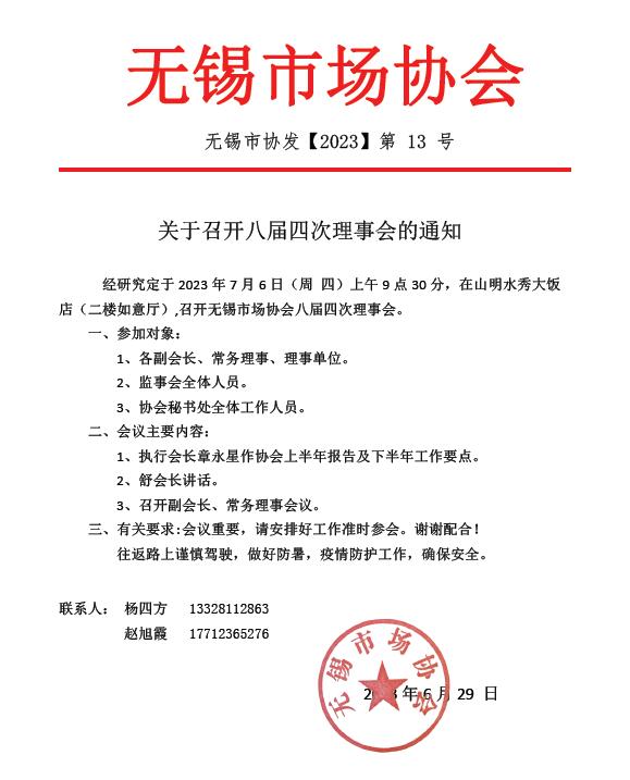 無(wú)錫市協(xié)發(fā)【2023】第13 號(hào)關(guān)于無(wú)錫市場(chǎng)協(xié)會(huì)召開八屆四次理事會(huì)的通知