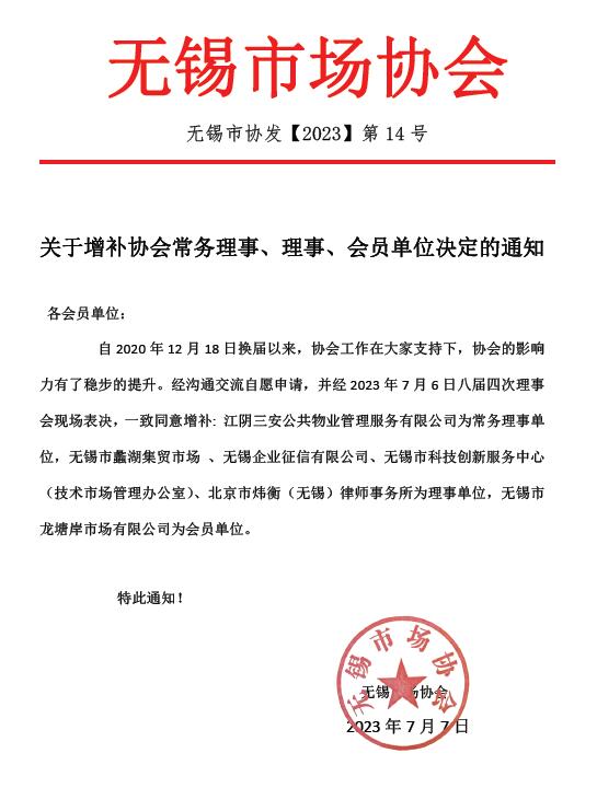 無錫市協(xié)發(fā)【2023】第14號關(guān)于增補(bǔ)協(xié)會常務(wù)理事、理事、會員單位決定的通知