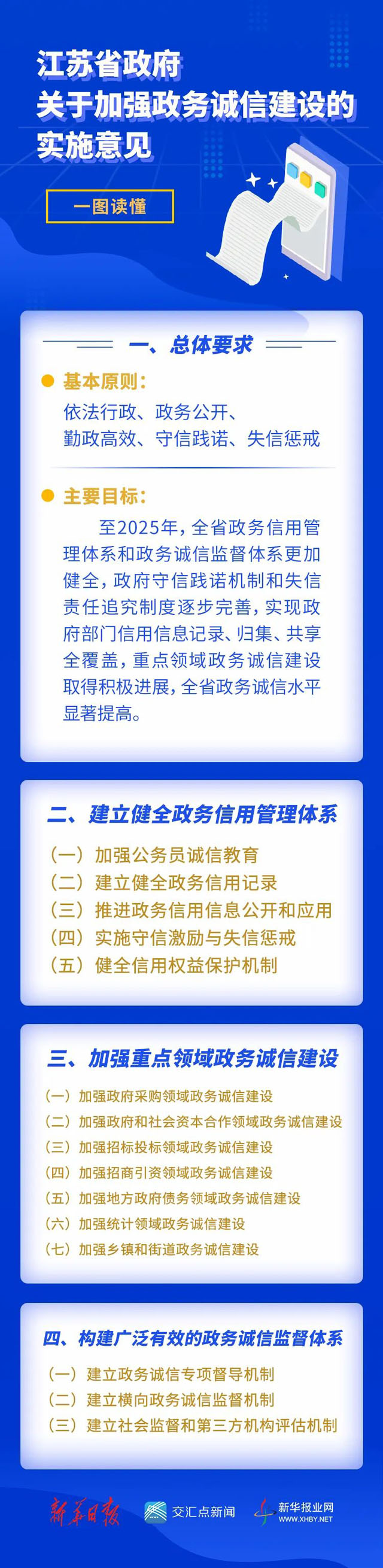 省政府日前印發(fā)《關(guān)于加強(qiáng)政務(wù)誠(chéng)信建設(shè)的實(shí)施意見(jiàn)》,切實(shí)加強(qiáng)我省政務(wù)誠(chéng)信建設(shè),充分發(fā)揮政府在社會(huì)信用體系建設(shè)中的表率作用,進(jìn)一步提升政府公信力,提高誠(chéng)信江蘇建設(shè)水平。