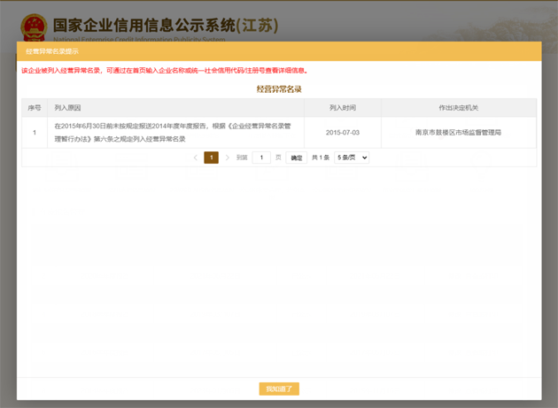 三、如果企業(yè)有失信信息,登錄后會自動(dòng)跳出提示窗口,點(diǎn)擊“我知道了”,進(jìn)入企業(yè)操作界面。