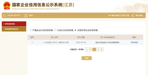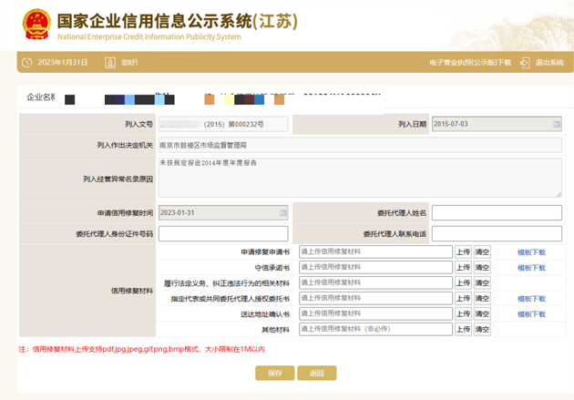 針對我省各級市場監(jiān)管部門列入的嚴(yán)重違法失信名單、經(jīng)營異常名錄和作出的行政處罰公示信息信用修復(fù),企業(yè)只要通過國家企業(yè)信用信息公示系統(tǒng)(江蘇)信用修復(fù)模塊在線遞交相關(guān)申請材料,不受時(shí)間、地點(diǎn)限制,即可“一鍵申請”。