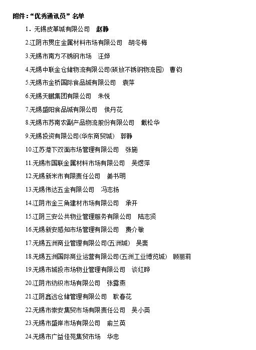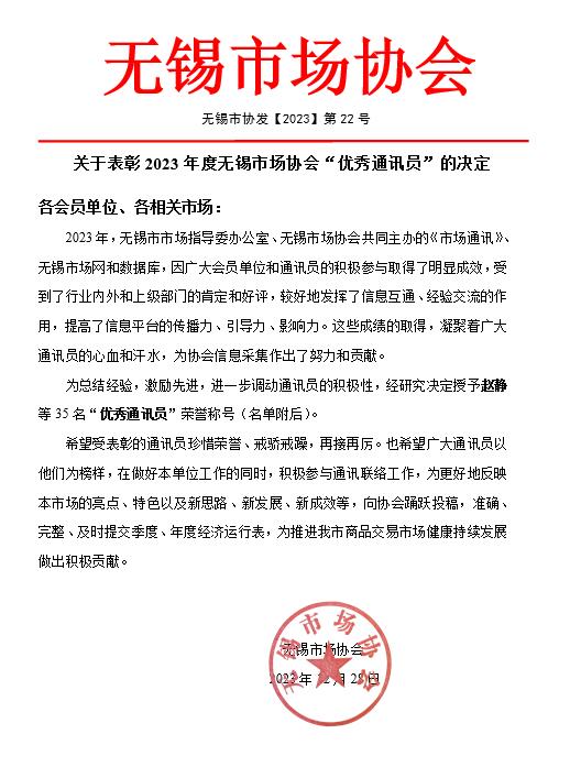 無錫市協(xié)發(fā)【2023】第22號(hào) 關(guān)于表彰2023年度無錫市場協(xié)會(huì)“優(yōu)秀通訊員”的決定