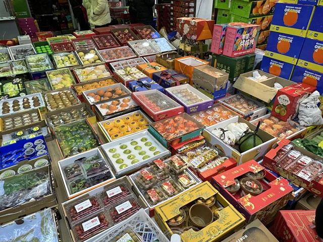 目前在市場各個倉位,各種各樣的新鮮水果品種齊全,包裝多樣,貨源豐富,禮盒琳瑯滿目,針對不同種類的水果,禮盒上的吉祥話也有所不同,“蘋蘋安安”,“大桔大利”,“心想事橙”,以滿足市民的不同需求。