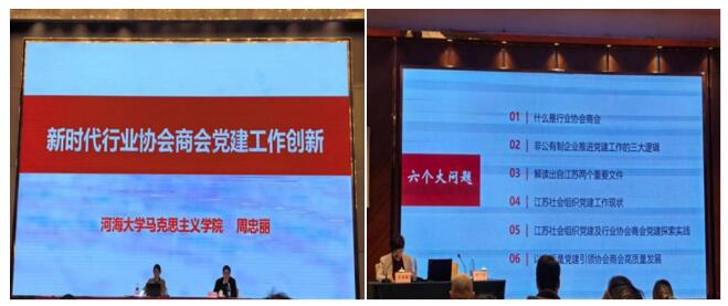 在授課環(huán)節(jié)中,邀請了河海大學馬克思主義學院周忠麗教授圍繞《新時代行業(yè)商會協(xié)會黨建工作創(chuàng)新》進行授課;(下圖左)