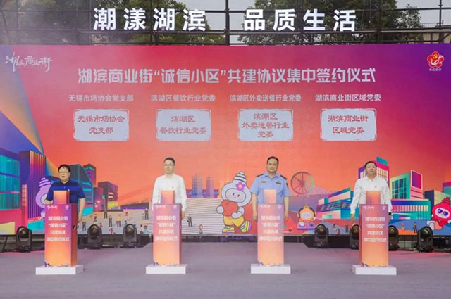 在湖濱商業(yè)街“誠信小區(qū)”集中簽約環(huán)節(jié): 無錫市場協(xié)會黨支部、湖濱商業(yè)街區(qū)域黨委與濱湖區(qū)餐飲行業(yè)黨委、濱湖區(qū)外賣送餐行業(yè)黨委共建協(xié)議。