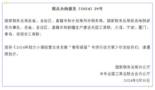 為深入貫徹落實(shí)黨的二十大和全國兩會精神,鞏固拓展主題教育成果,持續(xù)優(yōu)化小微經(jīng)營主體稅費(fèi)服務(wù),聚焦落實(shí)國務(wù)院推動(dòng)“高效辦成一件事”部署要求,推進(jìn)“便民辦稅春風(fēng)行動(dòng)”走深走實(shí),促進(jìn)民營經(jīng)濟(jì)發(fā)展壯大,國家稅務(wù)總局與全國工商聯(lián)決定,聯(lián)合開展2024年助力小微經(jīng)營主體發(fā)展“春雨潤苗”專項(xiàng)行動(dòng)(以下簡稱“春雨潤苗”行動(dòng)),特制定本方案。
