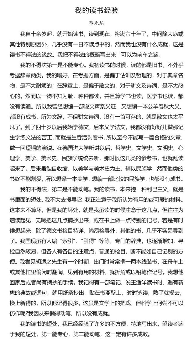 今天我們一起來讀一讀蔡元培發(fā)表在《文化建設(shè)》第1卷第7期的《我的讀書經(jīng)驗》。與其他名家談讀書不同的是,蔡元培先生竟自言“沒有什么成就,實為讀書不得法的緣故”,并在文中“把不得法的概略寫出來,以為前車之鑒”,先生作此文時已六十多歲,學(xué)界泰斗,讀書五十多載,如此謙遜而真摯的言詞,背后的深意卻是關(guān)于讀書之常識,其實,讀書就是這么“簡單”。
